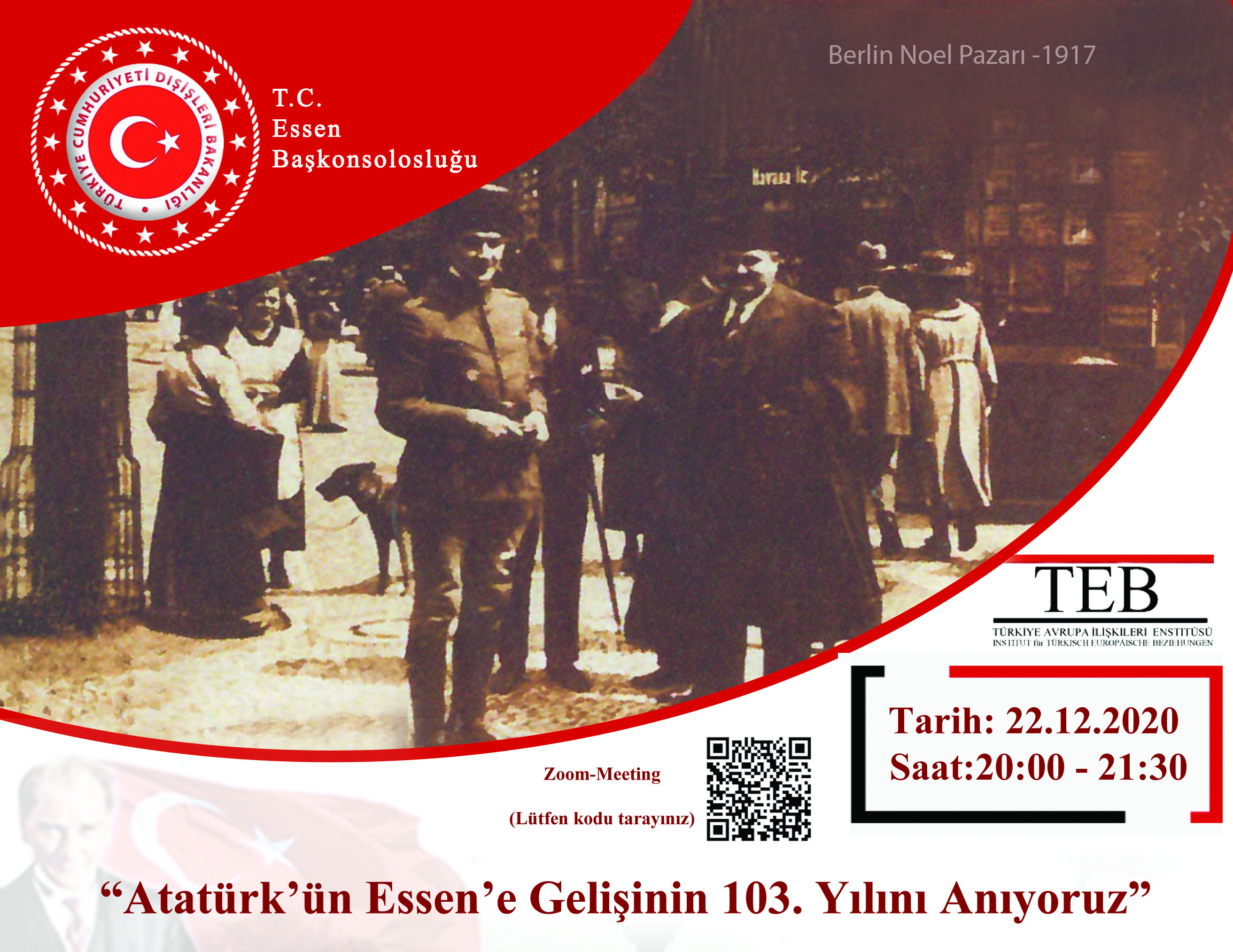 Cumhuriyetimizin kurucusu Ulu Önder Atatürk'ün Veliaht Sultan Vahdettin'e refakaten 22 Aralık 1917 tarihinde Essen'i ziyaretinin 103. yıldönümü münasebetiyle düzenleyeceğimiz video konferansın afişi ve programı ektedir.