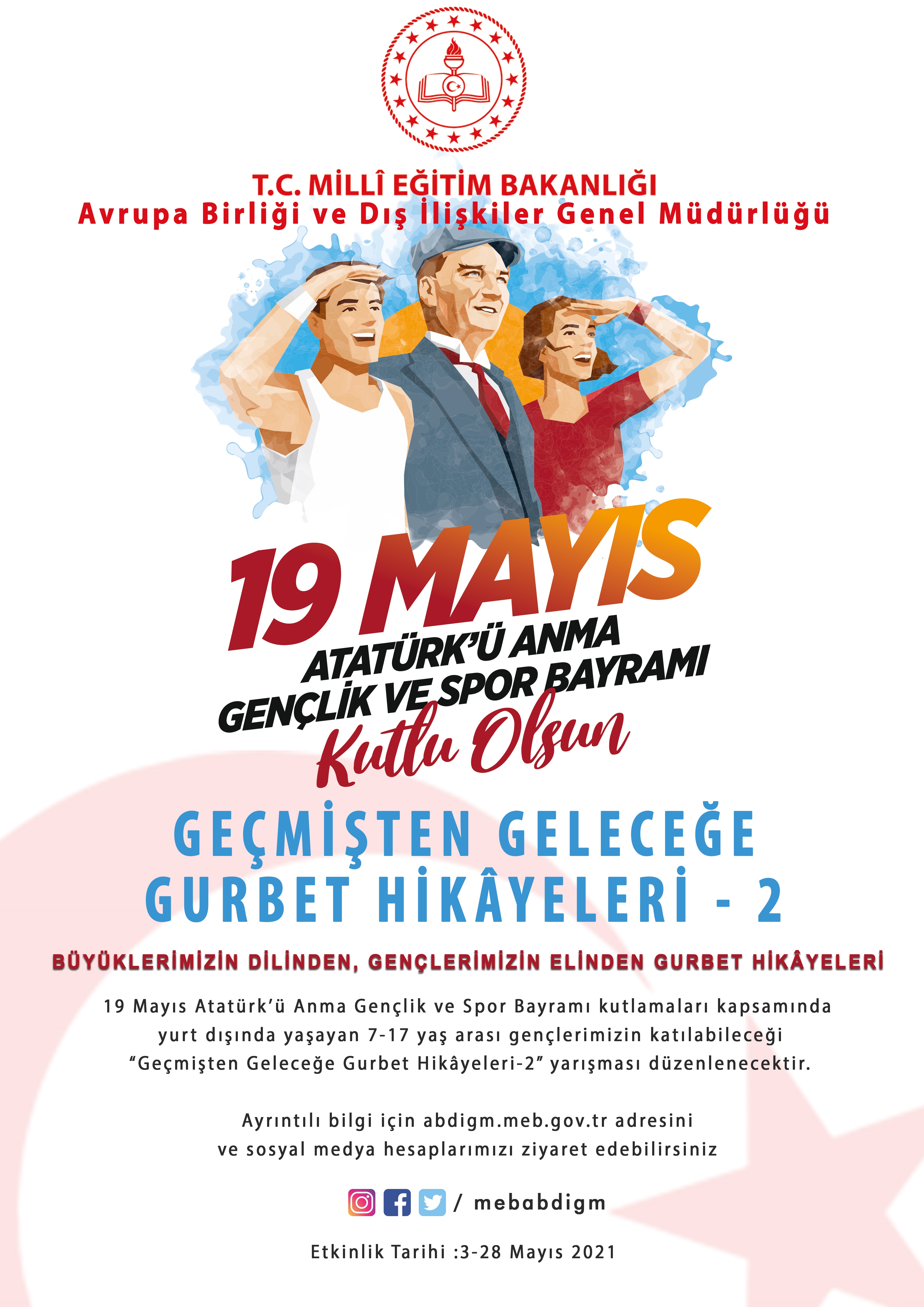 Milli Eğitim Bakanlığımız tarafından, Milli Mücadele’nin başlatılması ve 19 Mayıs Atatürk’ü Anma Gençlik ve Spor Bayramı kutlamaları kapsamında, yurtdışında yaşayan 7-17 yaş arası çocuklarımızın ve gençlerimizin katılabileceği “Geçmişten Geleceğe Gurbet Hikâyeleri 2” yarışması düzenlenecektir.